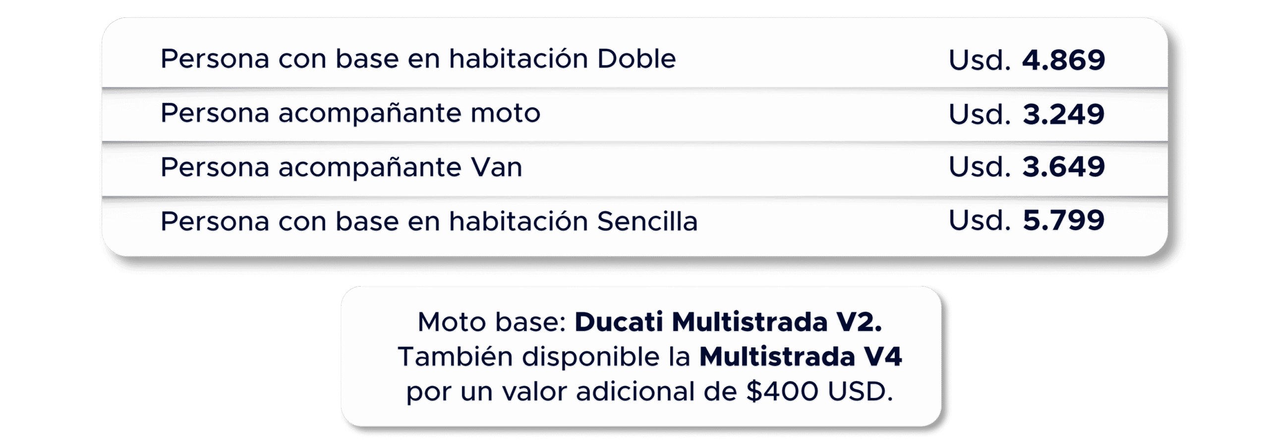 - Ducati Multistrada V4s, por un valor adicional de $400 USD.