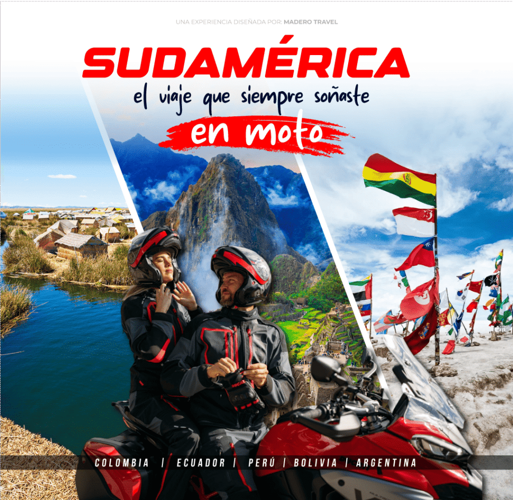 Travesía Sudamericana es un viaje único que nos lleva a descubrir la diversidad, cultura y paisajes de Sudamérica sobre dos ruedas. Desde los Andes hasta la costa del Pacífico, cruzaremos fronteras, exploraremos desiertos, valles y selvas, y nos maravillaremos con maravillas naturales como Machu Picchu, el Lago Titicaca y el Salar de Uyuni. Cada etapa combina aventura, historia y tradición local, mientras compartimos la emoción de rodar juntos, la camaradería y la riqueza cultural de los países que visitamos. Prepárate para una experiencia inolvidable, llena de paisajes impresionantes, sabores auténticos y momentos que quedarán para siempre en la memoria.